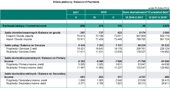 Widzimy, że saldo rachunku bieżącego uległo dalszemu pogorszeniu, zarówno w stosunku do danych sprzed kwartału, jak i dla porównywalnego okresu poprzedniego roku. Jeszcze kwartał temu mieliśmy na rachunku bieżącym skumulowaną, roczną nadwyżkę 838 mln PLN, a już po maju mamy skumulowany, roczny deficyt w wysokości -3,870 mln PLN.