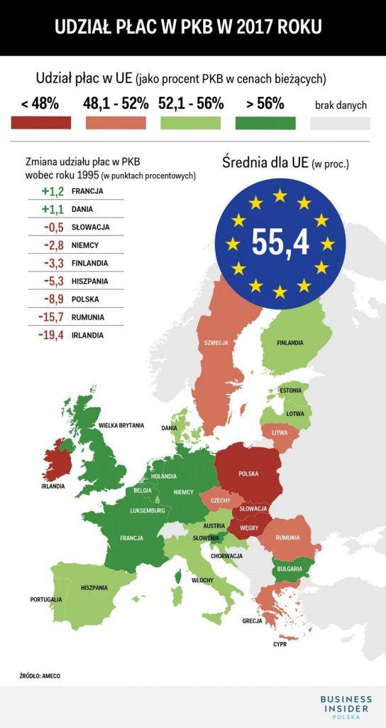 Spójrzmy na powyższą grafikę. Dla Polski udział płac w PKB wyniósł 48% w 2017 roku. Dla innych krajów naszego regionu wygląda to podobnie. Zgoła inaczej wygląda ten sam wskaźnik dla krajów rozwiniętych Europy Zachodniej, gdzie średnia to około 55%.