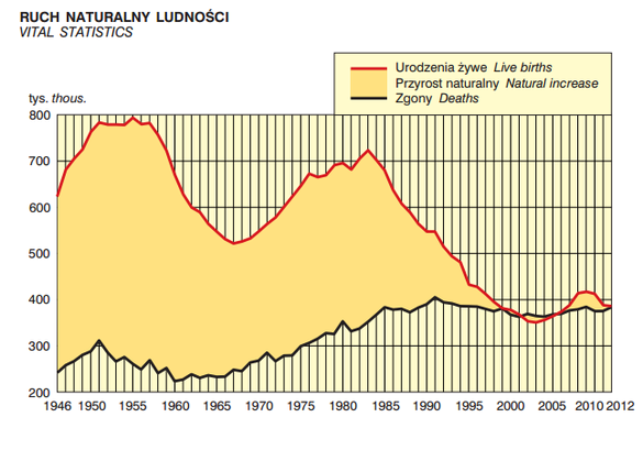 Tak więc już widzisz jakie będzie zapotrzebowanie na mieszkania w niedalekiej przyszłości. Chude lata idą !! O imigracji pogadamy później. Kurczenie się grupy młodych-głodnych na mieszkania jest ewidentne. Należy sobie też zadać pytanie: Ile % ludzi na piramidzie ma już swoje M4?? Kolejnym istotnym punktem analizy jest struktura sprzedaży nieruchomości. W grupie 35-55l sprzedaż jest raczej równoważna zakupowi mieszkania o lepszym metrażu czy standardzie. Po 55L aż do dnia Z mało kto sprzedaje. I ostatnim punktem rozważań jest ustalenie procentu mieszkań na sprzedaż po seniorach, bo coś z tym RE po nich musi się raczej stać. Wg. GUS średnia długość życia w naszym kraju wynosi 76 lat: 73 dla mężczyzn i 81 dla kobiet. Dane te warto brać pod rozwagę i porównać z ilością potencjalnych kupujących z grupy 25-34L. Zakładając te same warunki dla ceny pieniądza dziś i w przyszłości możesz bardzo szybko ocenić jak się będą rozkładać siły popytu vs podaży. Moim okiem ceny mieszkań z powodu demografii będą spadać. A poniżej grafika przedstawia Przyrost naturalny ludności Polski w latach 1946-2012 i przyszłość demograficzną w naszej krainie. Obecna dzietność w PL to około 1.34 (w 2016r), czyli 1000 mam rodzi 1340 dzieci, za jedno pokolenie te nowe mamy urodzą średnio 897 dzidziusiów, a za dwa pokolenia nowych Polaków urodzonych przez te mamy będzie tylko 601. Spadek współczynnika dzietności poniżej 1.4 powoduje podobno, że społeczeństwo skazane jest na wymarcie. Przybliżony rozkład współczynnika dzietności na świecie za rok 2016 można znaleźć na CIA Word-FactBook-u.