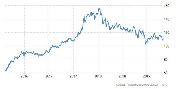 Cena lithium futures od kilku lat wzrastała, aż w Q2-3 2018 r. osiągnęła na ten moment historycznie wysokie ceny dochodzące szczytowo do 160 USD. W chwili obecnej lithium futures oscylują w okolicy 110 USD jak przedstawiono poniżej.