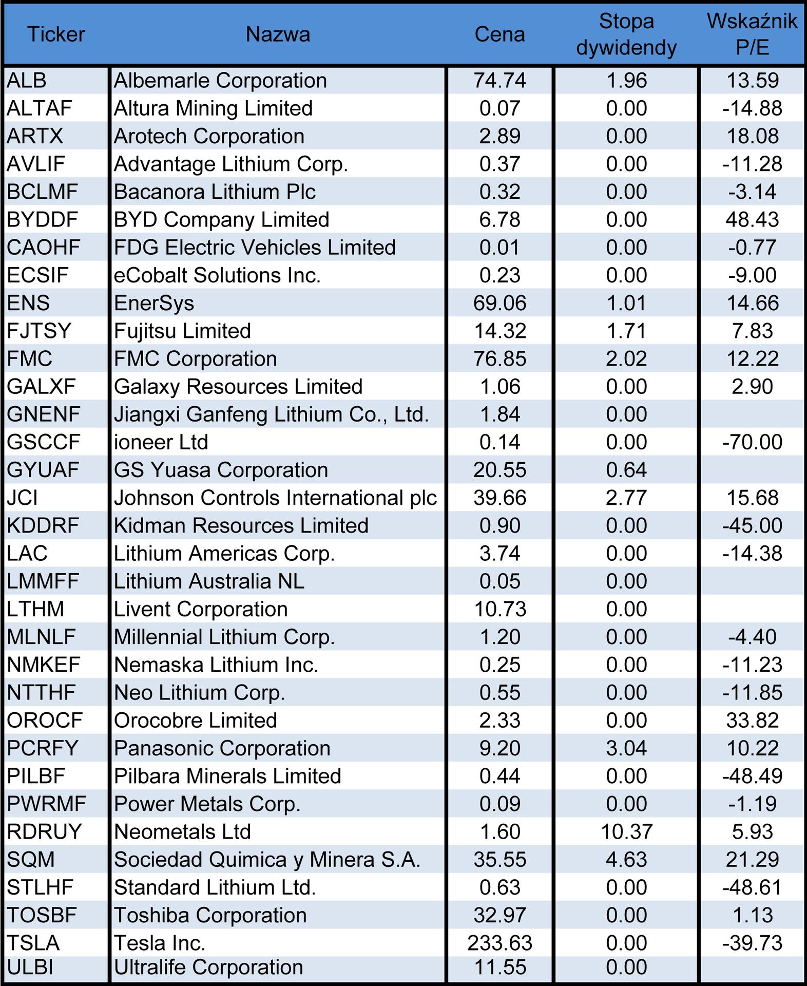 Kolejną pozycją jest SQM, działająca w Chile, ale notowana na NYSE, podobnie - najbliżej nam dostępna jest dzięki Global X Lithium & Battery Tech ETF. Wszystkie z powyższej trójki wypłacają dywidendę udziałowcom.