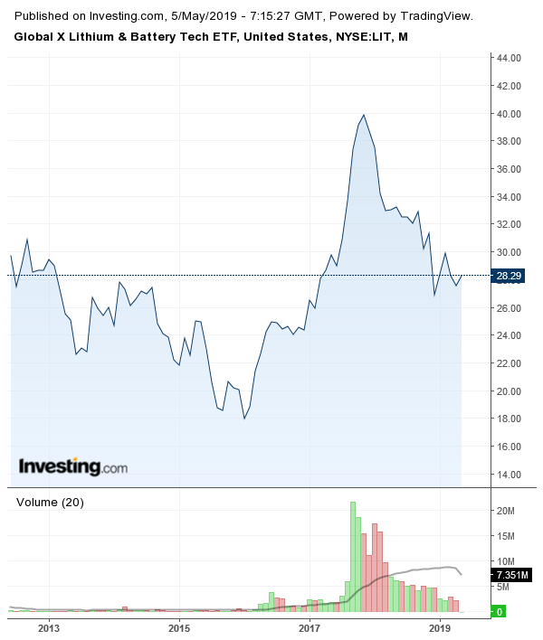 Następnie spójrzmy na Livent, czyli dywizję argentyńskiego FMC, dedykowana tylko i wyłącznie litowi. Dzięki temu kondycja pozostałych produktów chemicznych wytwarzanych przez FMC, nie ma na nią wpływu. Od października 2018 r. notowana na NYSE. Inwestować w Livent możemy niebezpośrednio, posiadając akcje FMC, bezpośrednio kupując na NYSE i pośrednio poprzez londyński Global X Lithium & Battery Tech ETF, który zdecydowanie ciąży w tę stronę.