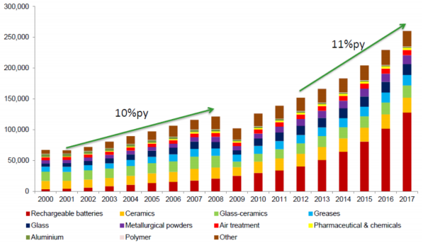 Od wielu lat głównymi czynnikami napędzającymi sektor litu są elektrownie wiatrowe, słoneczne, oraz coraz bardziej zyskujący na znaczeniu sektor rozwoju samochodów elektrycznych. Na poniższym diagramie możemy zauważyć ciągły przyrost całkowitego zapotrzebowania na lit (zaburzony co prawda w latach 2009-2010 r). Widzimy wyraźnie, że udział różnych produktów końcowych pozostaje na właściwie niezmienionym poziomie, poza jednym sektorem, który od kilku lat rośnie jak szalony - sektorze baterii.