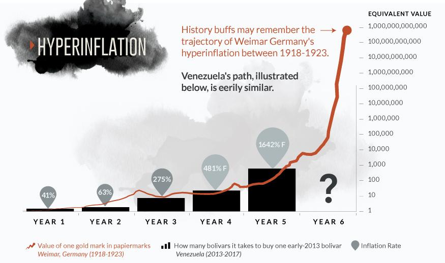 W Wenezueli wystąpiła taka sytuacja gdzie na rynku jest mnóstwo niechcianej waluty i ciągle rośnie, ale istnieje stała ilość papieru toaletowego i jest on dość często używany jako płacidło. Ludziki wolą posiadać papier toaletowy bo nie traci on wartości (użytku) a waluta traci ją codziennie. Papier toaletowy staje się pieniądzem bo jest wymieniany na inne rzeczy, gdyż wożenie waluty na taczkach nikomu nie sprawia przyjemności. Był tam już okres kiedy Bolivar stracił 15% w dzień i 50% w 10 dni. W przypadku bardzo dużej inflacji nie opłaca się nawet liczyć kasy, bo czas jest o wiele bardziej cenniejszy a ceny zmieniają się z minuty na minutę. Hiperinflacja to wyścig z czasem dla ludzi bo z sekundy na sekundę mają mniej kawy w kubku, a towar jest warty więcej niż waluta-papier -> death spiral of currency. Prawo Kopernika zawsze działa i mówi że pieniądz-tandeta idzie do ścieku pierwszy. Jedna umiera i rodzi się nowa.