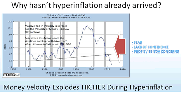 Podczas hiperinflacji szybkość obiegu pieniądza wystrzeliwuje do góry, ponieważ wszyscy starają się uzyskać resztę siły nabywczej z waluty zanim całkowicie ona zniknie. Gorący kartofel. Pomyśl sobie co by było gdybyś żył w cashless society i podatek od trzymania kasy w banku byłby zwiększany o 1% tygodniowo :)