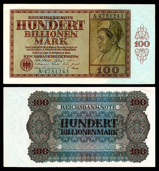 Zaczęło się o Traktatu w Wersalu, gdzie Niemcy miały zapłacić straty wojenne. Potem zaczęli się zadłużać, ale nikt nie chciał już pożyczać więc poszli w dodruk. Przypuszcza się, że dewastacja jaka się dokonała przyczyniła się do powstania Hitlera. Poniżej największy nominał jaki wydrukowali: 100 bilionów Marek. Więcej w temacie w The Nightmare German Inflation.