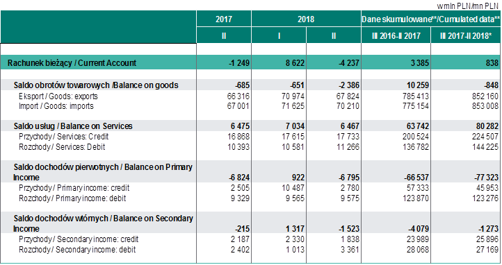 Widzimy, że saldo rachunku bieżącego uległo dalszemu pogorszeniu, zarówno w stosunku do danych sprzed kwartału, jak i dla porównywalnego okresu poprzedniego roku. Jeszcze kwartał temu mieliśmy na rachunku bieżącym skumulowaną, roczną nadwyżkę 838 mln PLN, a już po maju mamy skumulowany, roczny deficyt w wysokości -3,870 mln PLN.