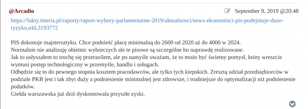 - Podnoszenie płacy minimalnej w pewnych rozsądnych granicach jest stymulujące dla gospodarki i wpływa na zwiększenie PKB, poprzez większą konsumpcję tych najmniej zarabiających, oraz zwiększone inwestycje pracodawców w unowocześnienie procesów. Jako rozsądną granicę uważam obecnie poziom krajów rozwiniętych czyli około 55% udziału płac w PKB. W Polsce jest to obecnie 48% czyli istnieje miejsce na około 7% wzrostu udziału płac w PKB czyli, uwaga 15% wzrosty płac – czyli dokładnie tyle ile proponuje rząd. Wyższe podniesienie płacy minimalnej spowodowałoby niechybnie ucieczkę przedsiębiorców do innych jurysdykcji, ewentualnie boom na automatyzację, co prowadziłoby do gwałtownego wzrostu bezrobocia.