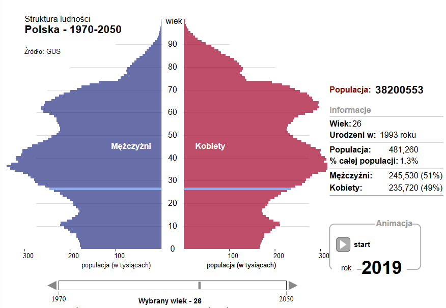 Source: wiking.edu.pl Pełną symulację GUS odnośnie polskiej demografii w latach 1970-20150 możesz znaleźć na: Struktura ludności według wieku w latach 1970 - 2050 - GUS. Dane na temat piramid demograficznych dla całego świata możesz podejrzeć pod: http://www.populationpyramid.net/pl/polska/2016/Wpływ piramidy demograficznej kraju jest znaczący z wielu powodów. Pokazuje ona rozkład klasy przed-produkcyjnej czyli jak rodziły matki, kiedy rodziło się najwięcej dzieci jak również jaka będzie dynamika gospodarcza, bo jak zapewne rozumiesz bez rąk do pracy PKB samo się nie wytworzy. Nowy człowieczek dziś pomyślany urodzi się średnio za 9m, a potem jest jeszcze obciążeniem średnio do 18L. Taka natura. Nie da się po-prostu wrzucić niemowlaka do szybko-waru i BOOM ci masz, za 3 dni jednostkę zakupową i silne ręce do pracy. Kto kupuje najwięcej? Statystycy ci powiedzą, że naturalną grupą kreującą popyt jest grupa wiekowa 25 do 35L. Popatrz chwilę na piramidę demograficzną dla PL na rok 2019, (tak, tak do przodu ze 2 lata bo ruchy na Real Estate są raczej powolne). A potem pooglądaj dalszą przyszłość. Kolorowo nie?