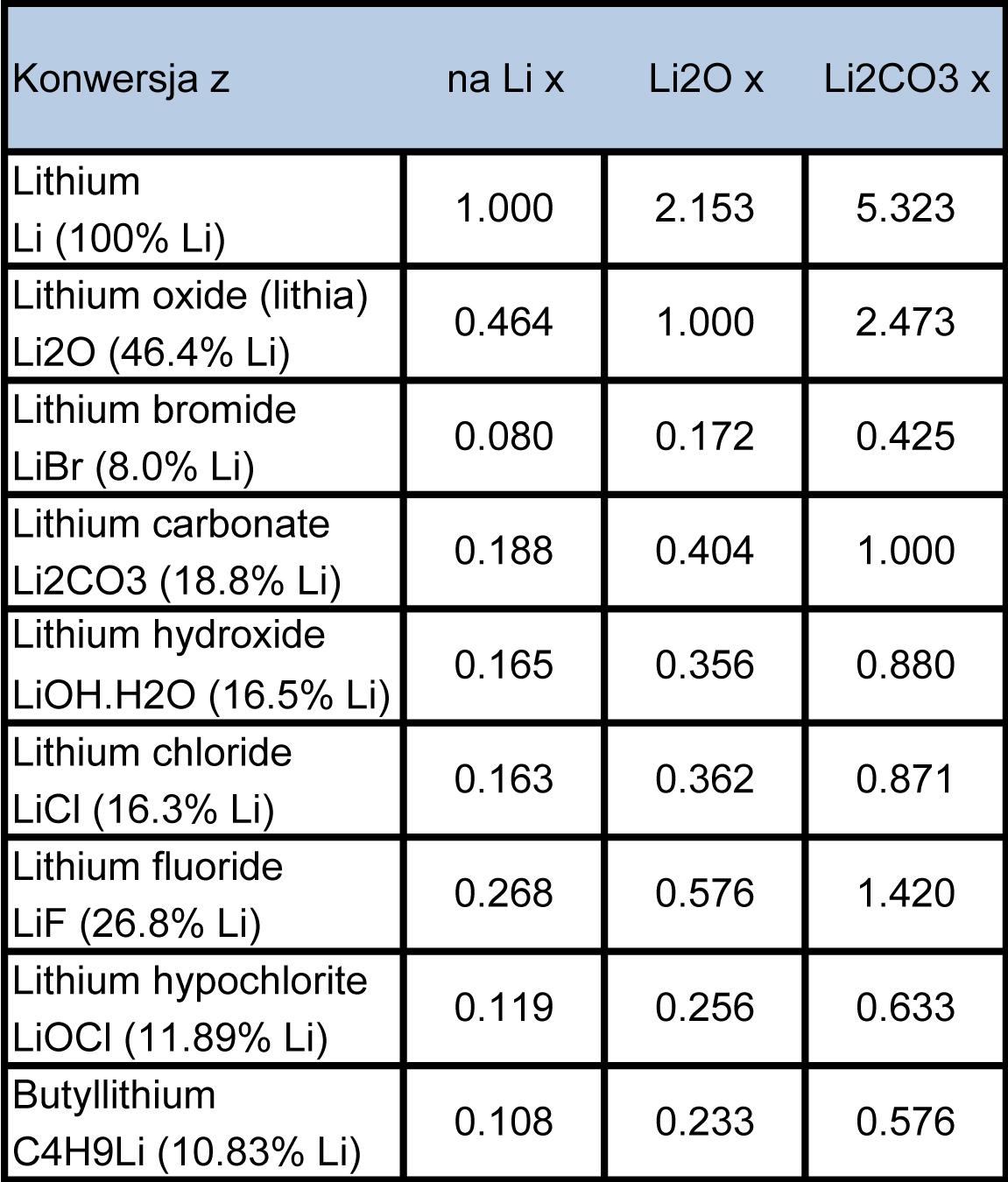 Głównym i najczęściej handlowanym produktem końcowym jest lithium carbonate, czyli węglan litu, noszący wzór chemiczny Li2CO3. Charakteryzuje się on jasnym kolorem i występuje w postaci sypkiej. Nie jest to czysty lit a raczej produkt z którego odbiorca uzyskuje czysty lit. Udział procentowy litu do pozostałych pierwiastków jest tu na poziomie 18%, czyli aby wyprodukować 1 kg czystego litu, wymagane jest 5.3 kg. węglanu litu. Statystyka statystyce nierówna, dlatego przy danych dotyczących produkcji litu należy zawsze patrzeć na informację o produkcie omawianym. Dla zainteresowanych oraz chemików pasjonatów poniżej przelicznik produktów wytwarzanych wobec tlenku litu i węglanu litu.