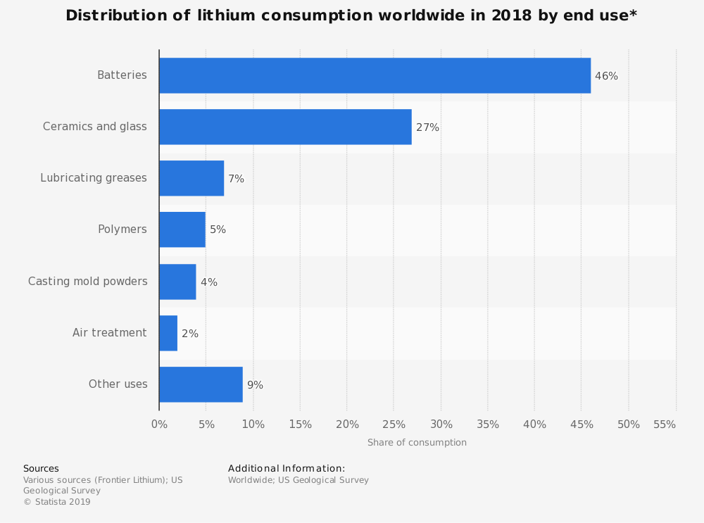 Kończąc rok 2018, rozkład procentowy pomiędzy głównymi kategoriami prezentuje się w sposób jak na wykresie poniżej. Można zauważyć, że baterie będące motorem napędowym sektora stanowią aktualnie 46% całego zapotrzebowania na lit i jest to wskaźnik wciąż rosnący. W 2013 r. oscylował dla przykładu w okolicy 30%.