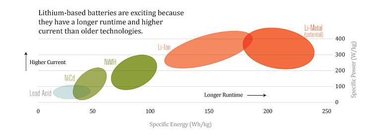 Na tym etapie ewolucji jesteśmy obecnie. Technologia baterii litowo-jonowej, określana mianem trzeciej generacji. Ale być może właśnie z niego wychodzimy. Zbliżyliśmy się bowiem do pozyskania maksymalnej wydajności w takim układzie. Bez fizycznego zwiększenia baterii - ergo - ilości ogniw w niej się znajdujących, nie jesteśmy w stanie zwiększyć już jej czasu działania, jak również zwiększenia poziomu oddawania energii potrzebnego do napędzania naszego urządzenia. Można przypuszczać, iż gdyby ludzkość rozwiązała problem skutecznego gromadzenia energii bez zwiększania masy akumulatorów, to prawdopodobnie już dawno temu sięgnęlibyśmy gwiazd. Tymczasem poniższa grafika przedstawia poziomy gęstości energii dla różnych rodzajów baterii.