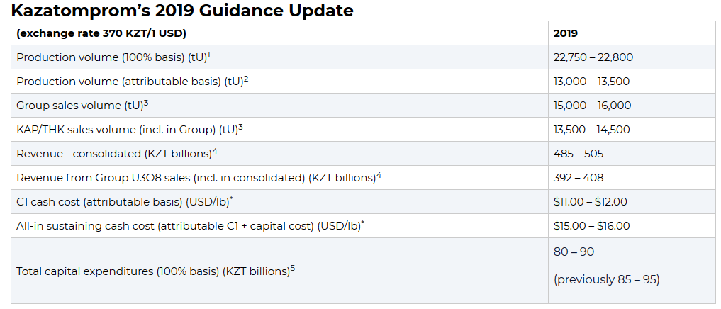 Moc wydobywcza Kazatompromu wynosi 25 tys. ton na rok, aczkolwiek z powodu utrzymujących się niskich poziomów cenowych nigdy nie została wykorzystana w pełni. W październiku 2011 r. zadeklarowano odgórny limit wydobywczy ustalony na 20 tys. ton, jednak został on uchylony już w rok później. W wyniku trwającego Fukushima Syndrome, w 2017 r. Kazatomprom zadeklarował kolejne cięcia produkcyjne o 10%, a w rok później o kolejne 20%, które to mają zostać rozłożone w czasie po 2020 r.