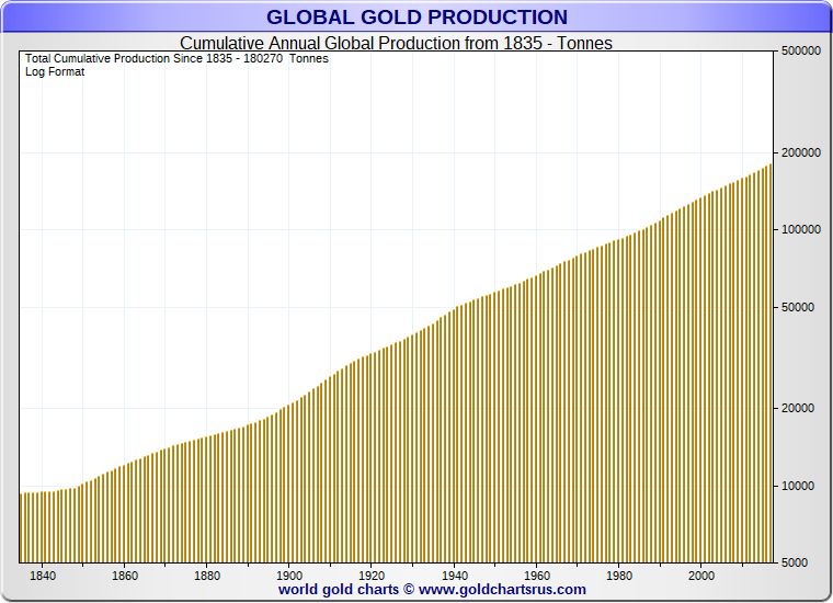 Przyjmując metodologię GFMS (jako najpowszechniejszą) należy odnotować, że ponad połowa liczonych całościowo wolumenów złota została wydobyta po 1980 r. Po II wojnie światowej roczne wydobycie kształtowało się na poziomie 1000 ton, aby wzrosnąć do 1450 ton w 1968 r., a następnie do 2571 ton w 1999 r. Od 2013 r. wolumeny wydobycia przekraczają rokrocznie 3 tys. ton, w 2018 r. przekroczyły 3.5 tys. ton, a 2019 r. z liczbą 3,463 ton przyniósł pierwsze od 2008 r. spadki w liczbach wydobycia. Autor nie omieszka tego opisać w dalszej części analizy.