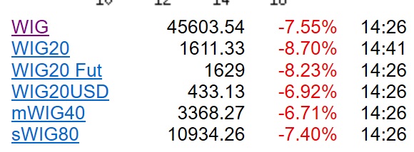 Wirus zainfekował w końcu giełdy. Na bardzo czerwono, a poniedziałek 9.03.20 ma szansę zostać Czarnym Poniedziałkiem. Poniżej ważniejsze indeksy światowe.